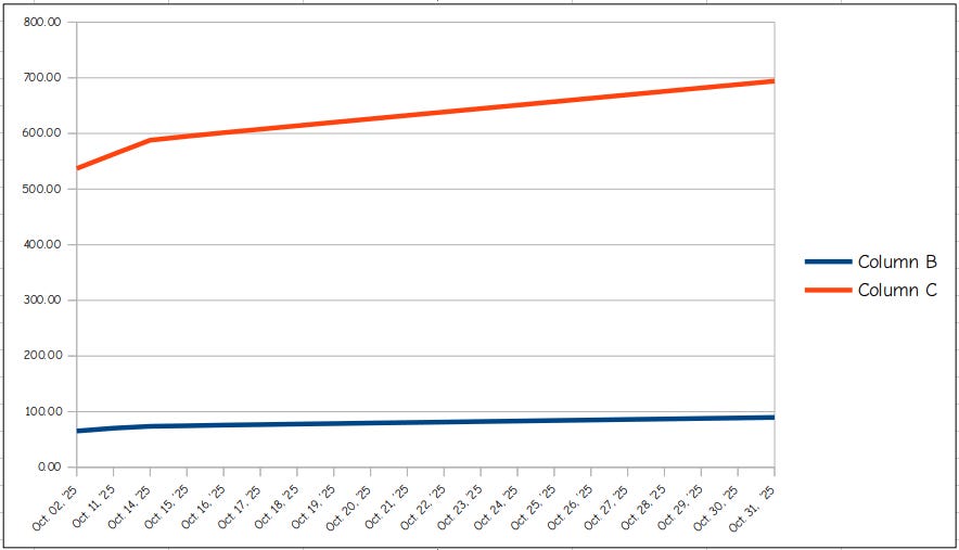 Suddenly I’ve been keeping close track as of October 14, of the trending prices of silver and gold, guesstimated same to the end of the month. My chart so far looks like this:
