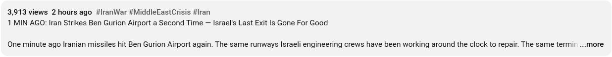“One minute ago Iranian missiles hit Ben Gurion Airport again. The same runways Israeli engineering crews have been working around the clock to repair. The same terminal the Israeli government has been publicly describing as days from partial reopening. Iran watched the reconstruction. It watched the government begin communicating a reopening timeline to a population that has been living without an exit since the first strike. And the moment that timeline became credible Iran struck it again. Not to finish what the first strike started. The first strike closed the airport. This strike closed it permanently. Because the message of the second strike is not the same as the first. The first said we can reach Ben Gurion. The second says every time Israel rebuilds it we will strike it again. Israel's last exit is not temporarily closed. It is gone for good.